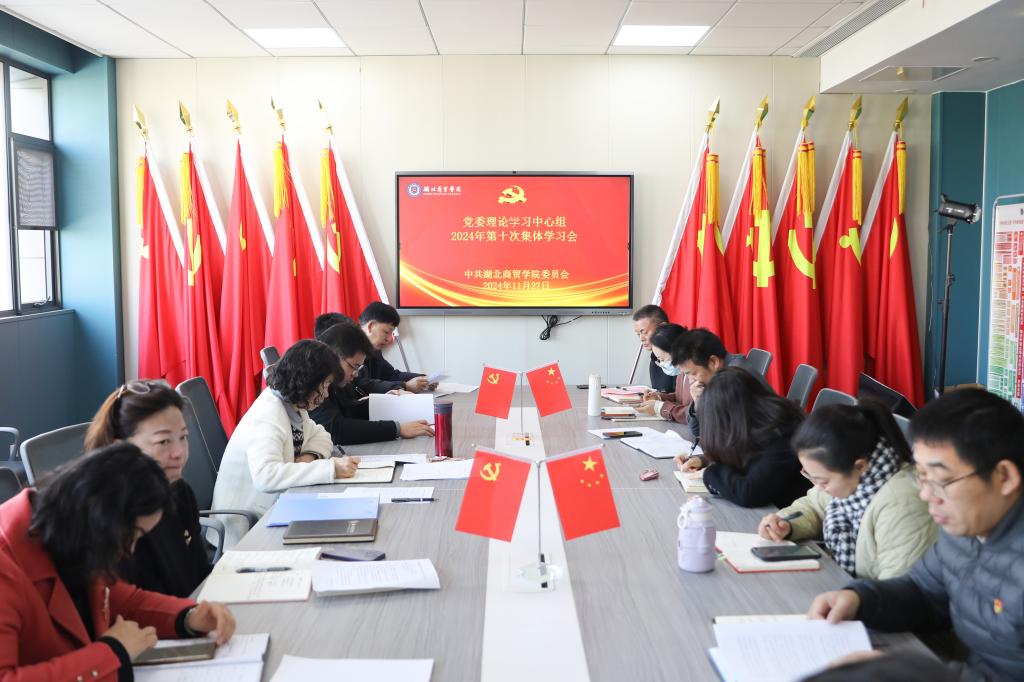 11月27日,学校召开2024年党委理论学习中心组第十次学习会,认真传达学习习近平总书记考察湖北重要讲话精神、在中共中央政治局第十七次集体学习重要讲话精神、在省部级主要领导干部学习贯彻党的二十届三中全会精神专题研讨班开班式重要讲话精神,传达学习《整治形式主义为基层减负若干规定》,研究学校贯彻落实措施。校党委副书记、纪委书记方爱荣主持会议并讲话,党委常委、副校长胡柳,党委常委、副校长程胜军出席会议。